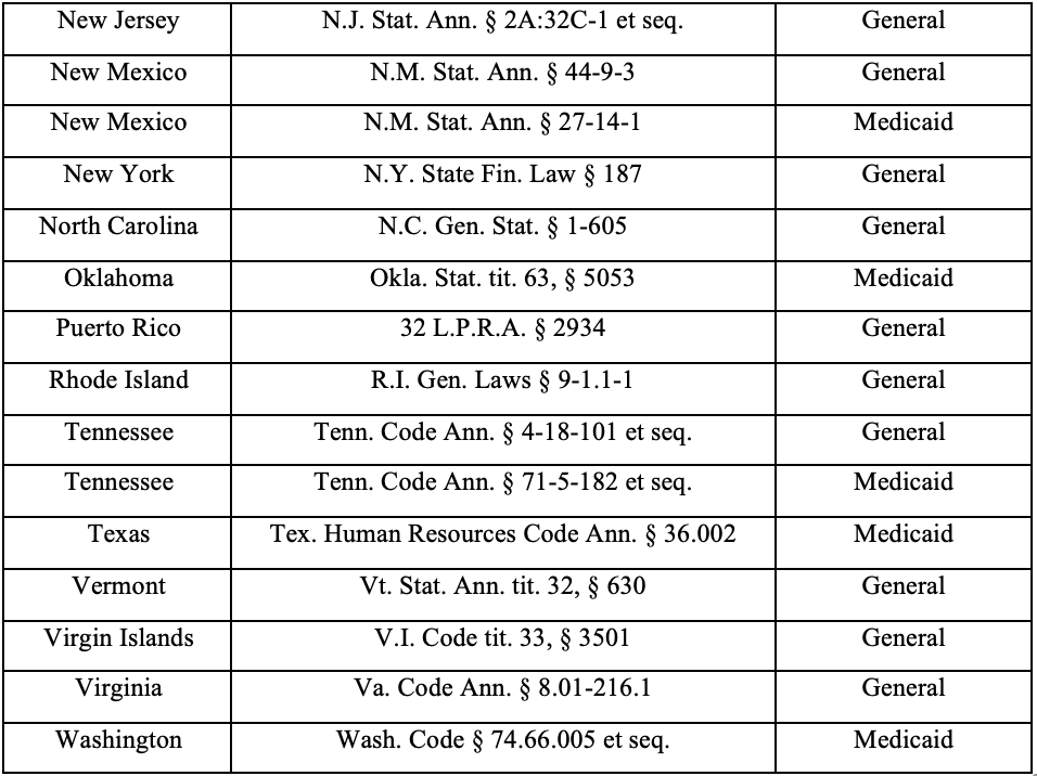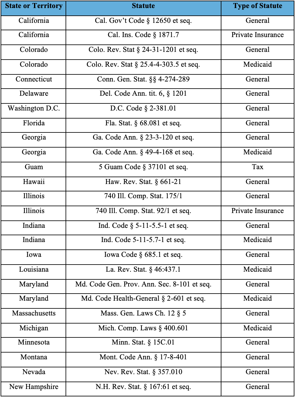 Seeing the success of the federal FCA, 33 states or territories have also passed false claims acts with qui tam provisions empowering whistleblowers to come forward with information to redress fraud committed against the state or territory. Many of these statutes mirror the federal FCA, with the exception that they seek redress of frauds committed against the specific state, rather than against the federal government. While many of the statutes follow the form and substance of the federal FCA, there can be important differences. For example, the federal FCA permits a cause of action based on any fraudulent claim to the Government. But the qui tam statutes in Texas and Oklahoma only permit private citizens to bring claims based on Medicaid fraud. Other states, such as Colorado, Georgia, Indiana, Maryland, New Mexico, and Tennessee have both a “general” false claims act and a Medicaid-specific false claims act. Adding more tools to the mix, California and Illinois have private insurance fraud statutes, permitting whistleblowers to bring claims seeking to redress fraud perpetrated against private insurers. In sum, there are 41 false claims acts pertaining to specific states or territories, as listed in the chart below: