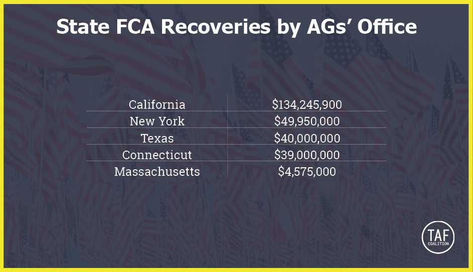 Amongst state attorney generals’ offices, California, New York, and Texas lead in recoveries. Overall, recoveries under state FCA cases totaled $271,123,374. Over two-thirds of state recoveries involved Medicaid fraud and the health care industry.